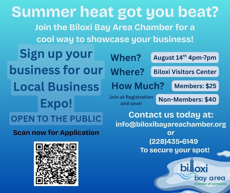 August 14 @ 4:00 pm - 7:00 pm CDT Summer Business Expo! Biloxi Bay Area Chamber 1050 Beach Blvd., Biloxi, MS, United States Get Tickets $25.00 – $40.00 3 tickets left